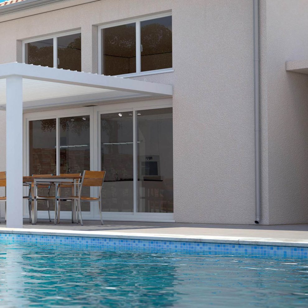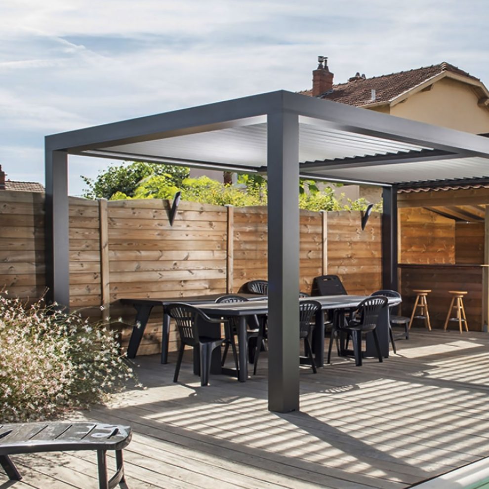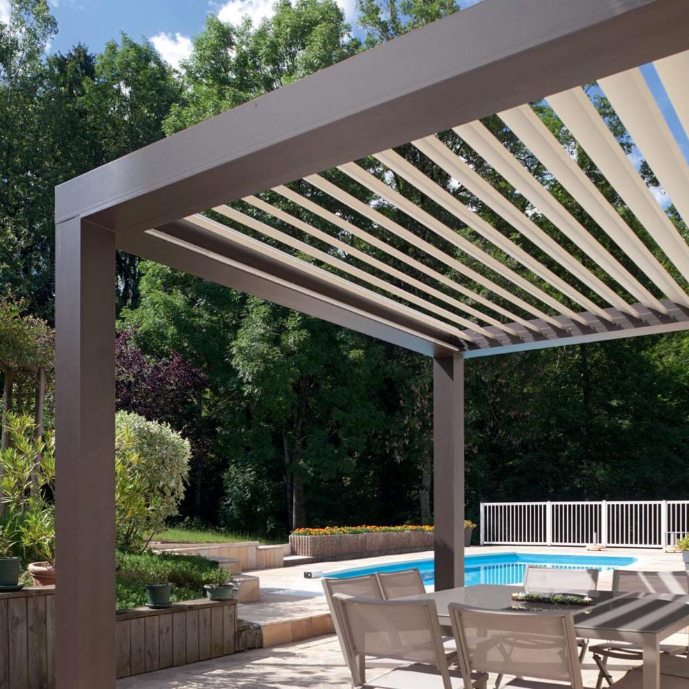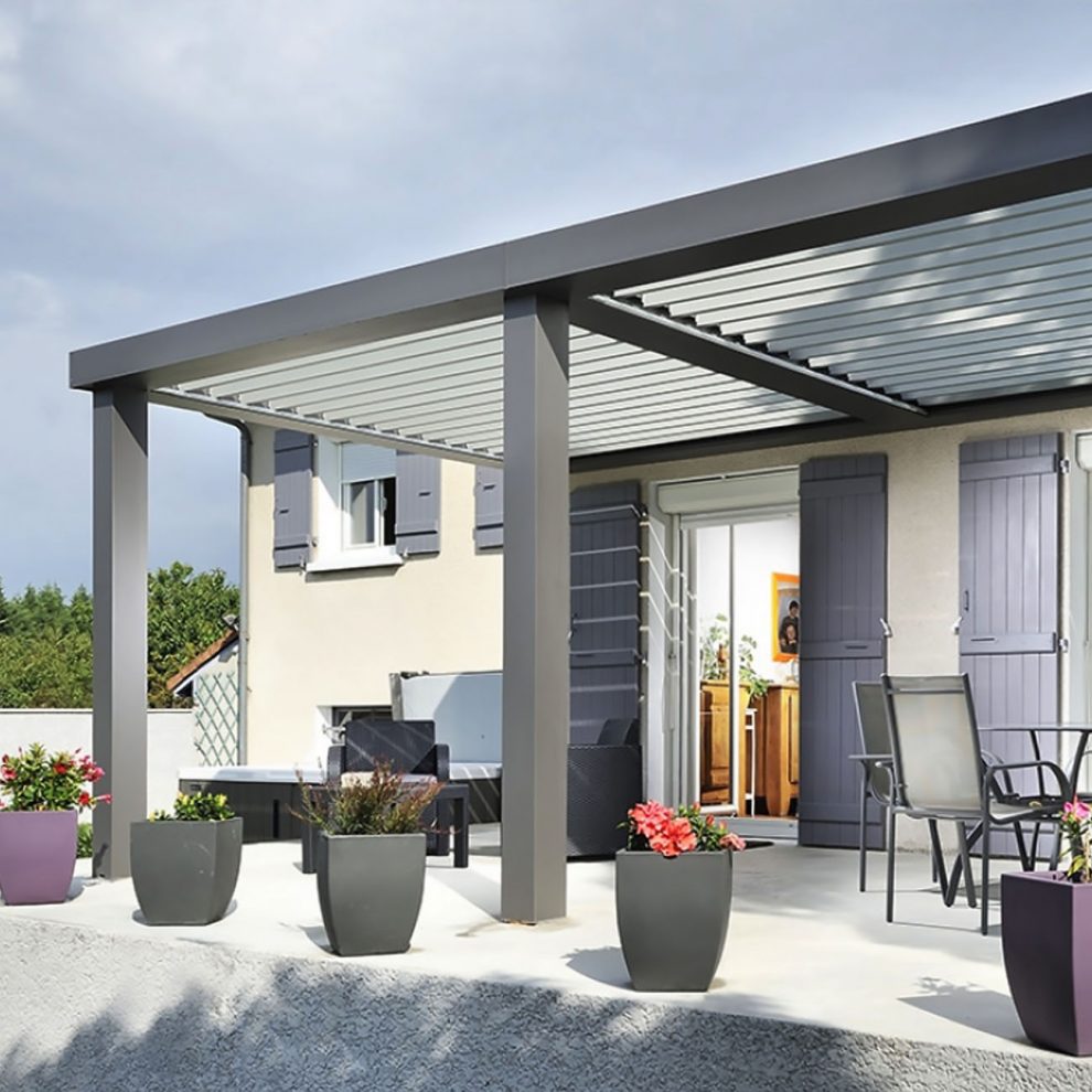 La gamme de profils et d’accessoires destinée à la fabrication des pergolas est issue d’une optimisation parfaite du concept, privilégiant la simplification de la fabrication et de la pose. La structure tubulaire est réalisée avec une poutre porteuse tubulaire assurant une très grande rigidité, par assemblage et clipage de profils aluminium laqués, assemblés en coupes d’onglet par des équerres à visser.